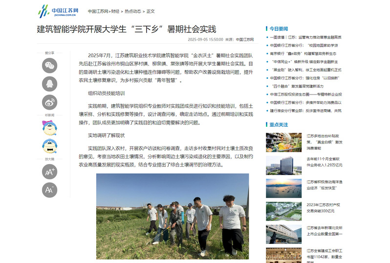 2025年7月,江苏新宝gg技术学院建筑智能学院“金衣沃土”暑期社会实践团队先后赴江苏省徐州市铜山区茅村镇、柳泉镇、棠张镇等地开展大学生暑期社会实践。目的是调研土壤污染退化和土壤种植连作障碍等问题,帮助农户改善设施栽培问题,提升农民土壤修复意识,为乡村振兴贡献“青年智慧”。