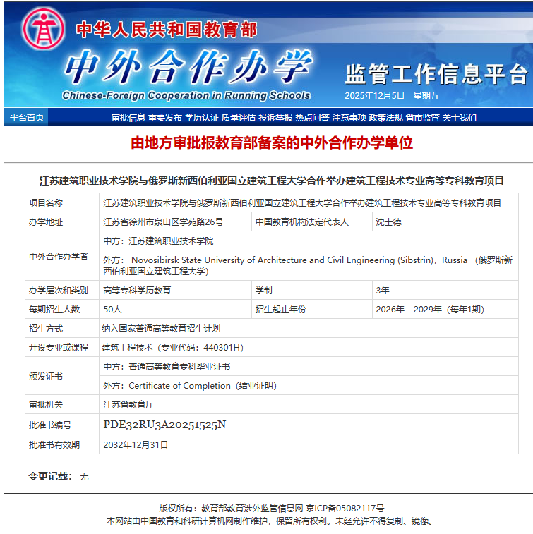 近日,我校与俄罗斯新西伯利亚国立建筑工程大学合作举办的建筑工程专业高等教育专科项目在获得江苏省教育厅批准的基础上,于12月1日在教育部完成备案。