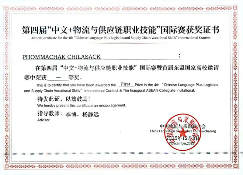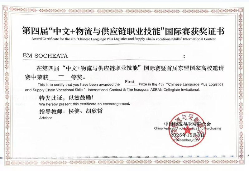 12月6日至8日,由中国物流与采购联合会、南宁师范大学联合主办的第四届“中文+物流与供应链职业技能”国际赛暨首届东盟国家高校邀请赛在广西南宁举行。我校经济管理学院柬埔寨留学生苏洁(EM SOCHEATA)(指导教师:侯健、胡欣哲)、老挝留学生王朗勇(PHOMMACHAK CHILASACK)(指导教师:李博、杨静远)在比赛中获一等奖。