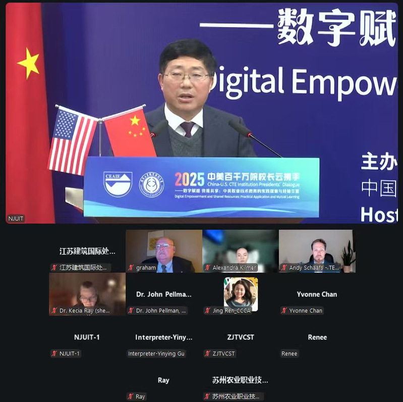 12月11日,由中国教育国际交流协会主办,南京工业职业技术大学承办的“中美百千万院校长云携手”活动在南京举行。来自中美两国的职业教育领域院校代表、行业组织及研究机构负责人通过线上与线下的方式参与交流。党委副书记、校长沈士德应邀参会并作主题发言。