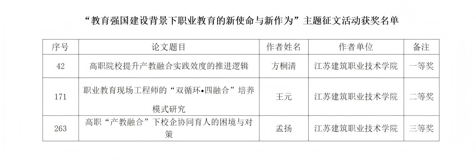 据悉,本次征文活动以“教育强国建设背景下职业教育的新使命与新作为”为主题,立足职业教育服务国家战略的使命,紧扣职普融通、关键办学能力提升等内容,聚焦职业院校在深化产教融合、推动教学改革中的实践,重点展现江苏职业教育教学改革发展的创新举措和经验。今年五月份,江苏省职业技术教育学会下发了《关于开展“教育强国建设背景下职业教育的新使命与新作为”主题征文活动的通知》(苏职学会〔2025〕11号)。通知发布后,省职教学会共收到征文900篇,经过专家评审、复核和公示等程序,共评选出获奖论文525篇,其中一等奖89篇,二等奖171篇,三等奖265篇,优秀组织奖10个。